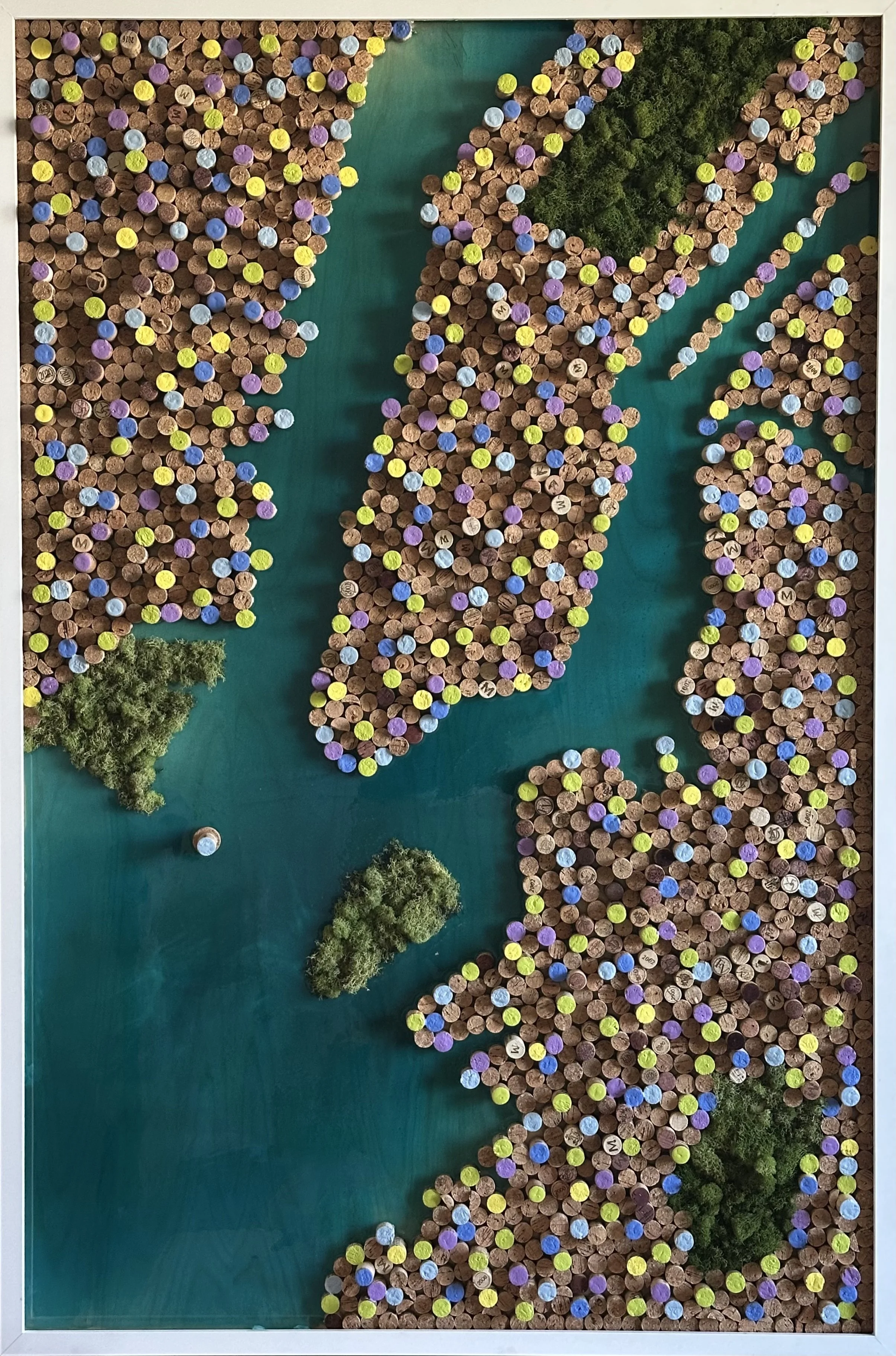 Stories We Made in New York is a large-scale wall sculpture built entirely from reclaimed natural wine corks. Each one was pulled from a bottle that marked something: a celebration, a connection, a night worth remembering. Gathered, sorted, and composed by hand, they come together here not as waste, but as a record.